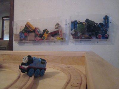 This past weekend she arranged her sons’ Thomas the Tank trains in clear office-file organizers. Brilliant!